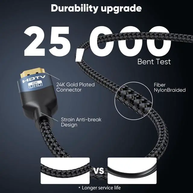 Real 8K HDMI 2.1 CableOur HDMI cables support high resolution 8K@60Hz (7680*4320). It smoothly supports 4K@120Hz & 2K@240Hz, ensuring a smooth and low-latency viewing experience. Compatible with HDMI 2.0 / 1.4 / 1.3 / 1.2 / 1.1 ^^ 48Gbps Ultra High SpeedOur HDMI 2.1 cord meets the standard HDMI 2.1 48Gbps, 3 times faster than 4K Visual. Supports HDCP 2.2 & 2.3, Dynamic HDR (HDR10+), SBTM, Enhanced Audio Return Channel (eARC), Variable Refresh Rate (VRR), Quick Media Switching (QMS), Quick Frame Transport (QFT), Dolby Atmos, DTS: X, 3D ^^ Long HDMI Cable 10 FT/3 MThis HDMI cable 10 feet is very suitable for remote scenes, such as home theater, office meetings and other remote scenes. It provides the right length while guaranteeing high definition, smooth and rip-free images. It is ideal for remote scenarios ^^ Universal CompatibilityOur HDMI 2.1 cable support various HDMI devices. Compatible with popular and latest devices including PS5, PS4, Xbox, TV, Roku, Apple-TV, Monitor, Computer, Laptop, Soundbar, Grapics Card, Blu-ray Player, DVD Player ^^ Excellent product qualityThe housing of our HDMI cable features an aluminum alloy high voltage electrostatic spray surface for improved heat dissipation. 100% pure copper core provides clear, sharp video and pure sound. Double braided premium nylon and tested and inserted 25, 000 + times, the military-grade stretch nylon material gives it greater durability ^^ Reliable After-SalesWe provide reliable after-sales support for 2 years. For assistance, please use official instant messaging system and we will respond promptly
