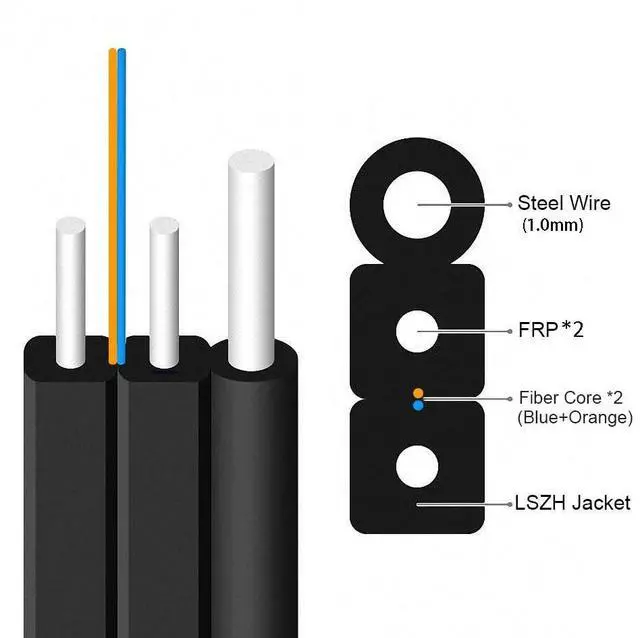 Etayson Fiber Optic Outdoor Drop Cable 2 Cores, G657A1 Fiber Core 9/125 Single Mode, 1 Steel Wire + 2 FRP Strengthen Member, LSZH Black Jacket, 1000 Meters/Roll