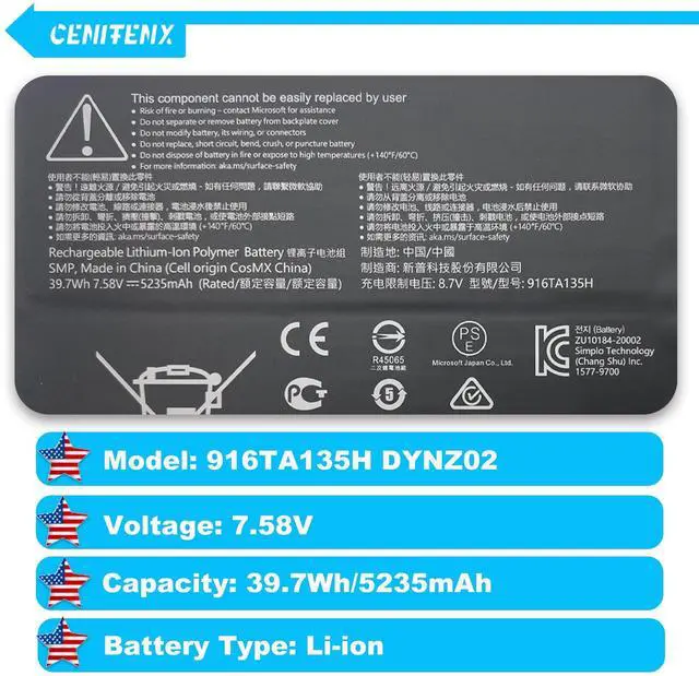 • Battery SpecsBattery replacement model: 916TA135H DYNZ02. Battery capacity: 5235mAh/39.7Wh, 7.58V.Battery type: Brand New Li-ion, the battery comes with repair toolkit.