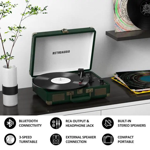 3-Speed and 3 Sizes TurntableSupport 33 1/3, 45, 78RPM and 7", 10", 12" Vinyl. Equipped with a reinforced turntable and sound-isolating feet, it can effectively prevent the vibration caused by playback and restore the most authentic music for you. ^^ Retro Suitcase Record PlayerThe combination of retro elements and modern craft design. Turntable in a vintage suitcase with a convenient carrying handle, allowing you to listen to your music anytime, anywhere, the way you want. ^^ Bluetooth Input PairingEasily Pair and play music from all your favorite devices like iPhone and Android smartphones, tablets through the turntables built in speakers using Bluetooth.