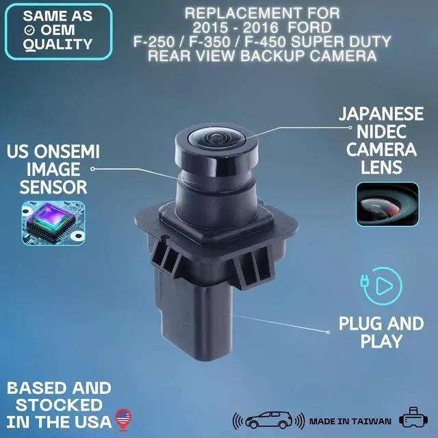 {Plug and Play} This device can be easily plugged into the existing OEM video harness. ^^ {Replaces} Backup Camera Compatible with 2015 2016 Ford F-250 / F-350 / F-450 Super Duty ^^ {OEM#} FC3Z19G490B FC3T19G490AD FC3Z19G490A GC3Z19G490B (FC3Z-19G490-B, FC3T-19G490-AD, FC3Z-19G490-A, GC3Z-19G490-B) ^^ {Specs} *Angle: 170 Degrees *Waterproof Level: IP68 *Resolution: 600 TV lines *Pixel: 728 x 582 *Signal: NTSC/PAL * Illumination: 0.1 Lux light (minimum) *Power: DC 12V ^^ {Important note} We recommend contacting your local dealer to confirm that the part number you are purchasing is an exact match for the part number you require, prior to making your purchase.
