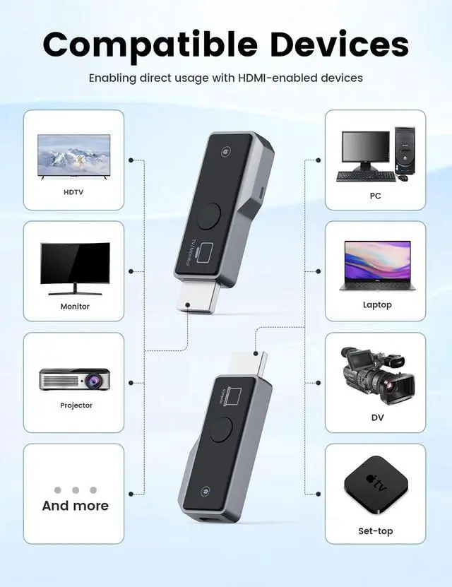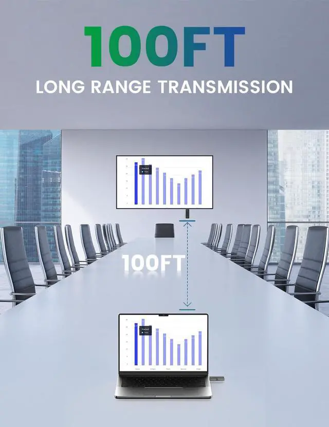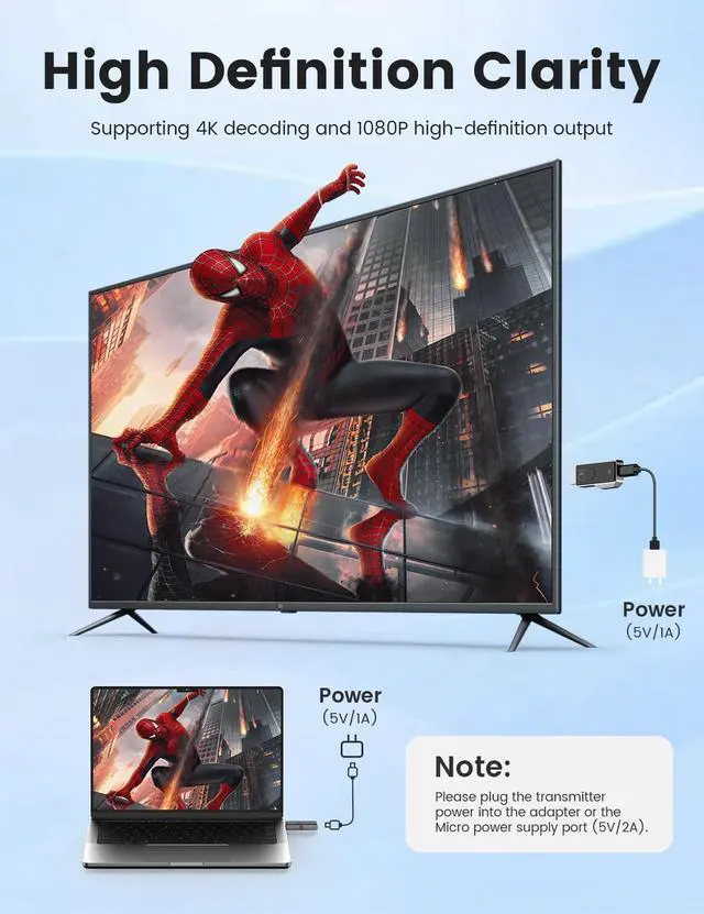 Plug and PlayWireless HDMI Transmitter and Receiver no need for complex applications, Bluetooth, or Wi-Fi, enjoy seamless, high-quality streaming. ^^ Ultra HD QualitySupports Ultra HD output with 1080P/60Hz frame rate, gives you a great screen experience. ^^ 98 Feet/30 Meters Wireless TransmissionThe wireless HDMI transmission distance reaches up to 98 feet/30 meters, utilizing a 2.4G /5G transmission protocol for stronger and more stable signals. ^^ Wide Compatibility Compatible with most HDMI devices, laptop, PC, Blu-ray Player, Camera, DVD, DSLR, Set-top boxes, Cable/Satellite boxes, tablet and more.