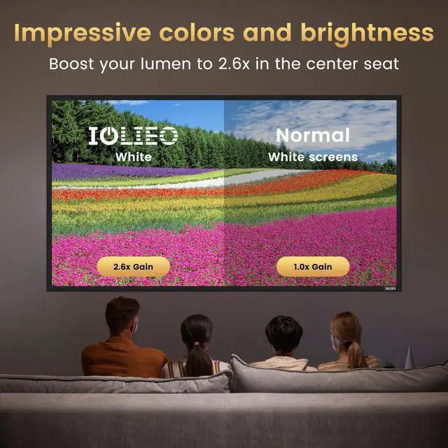 BRIGHTNESS BOOSTThis screen displays significantly brighter images than a normal white screen when viewed from center seats (up to 2.6x gain), and maintains comparable brightness from other angles. Enjoy a brighter image, or use the brightness for a bigger screen! (NOT for UST projectors.)