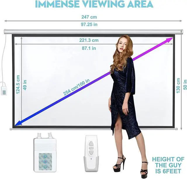 DINAH motorized projector screen built-in ultra-quiet, energy-efficient motor can rise and fall smoothly. With remote control can make the screen go up or down conveniently and quickly within 82ft, and there is also a wall mountable control panel can control it. ^^ Our projection screen gives impeccable viewing experience due to 1.2 Gain, active 3D and 4K Ultra HD, decent size 16:9 aspect ratio, 160 degree wide viewing angle, perfect for home, schools, offices, weddings, church, or outdoor movie screenings; can be used for PowerPoint presentations and other displays ^^ All-steel casing construction better reduces the risk of deformation and damage whether in transportation or use; quality projector screen is made of premium PVC matte makes it wrinkle free, easy to clean, flame-retardant and odorless, three-layer material pressed projection screen with black backing prevent light from penetrating the screen ^^ No manual assembly required, can be easily installed, you can fix it on the wall directly with screws, or hang it on the ceiling with 2 expansion hooks ^^ DINAH motorized projector screen provides you with higher safety, we can offers 2 YEARS QUALITY PROMISE, please contact us if you have any questions.