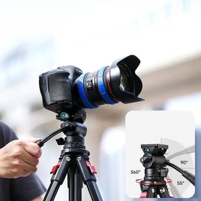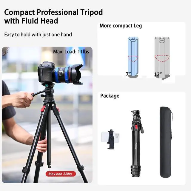Ideal for DSLR and SLR cameras, telescopes, horizontal laser levels, projectors, or other equipment that requires stability. ^^ A better fluid head will help you catch each shot. 360 Pan silky smoothly, left and right handle bar, level bubble, Quick release system and anti-lost lock, 1/4" screw for universal devices. Yes, it with all features to work professional. ^^ This DSLR/SLR tripod features a triangular cross-section for the central column, providing excellent stability while adding to its aesthetic appeal. The legs are designed with a unique hexagonal shape, which, when collapsed, fit tightly together with the central column and other components.