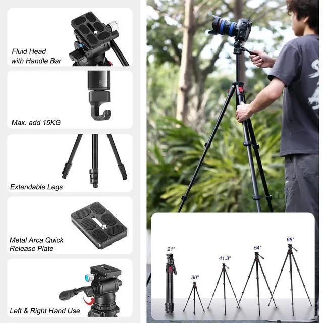 If you wanna a travel tripod but don't want compromise the sturdy and function, this is the one. Closer Leg design make it as light as a bottle of water. So as well as the fluid head, best tripod combo for outdoor, travel, vlog, hiking photography and videograghy. Comes with carrying bag and phone holder for easy use. ^^ This tripod is made of lightweight aluminum and solid ABS at the joints, can use for years. Extenable from 18.5 to 68 inches, suitable for most people. Center column can be inverted allowing for ground-level macro photography, prefect for close-up shots.