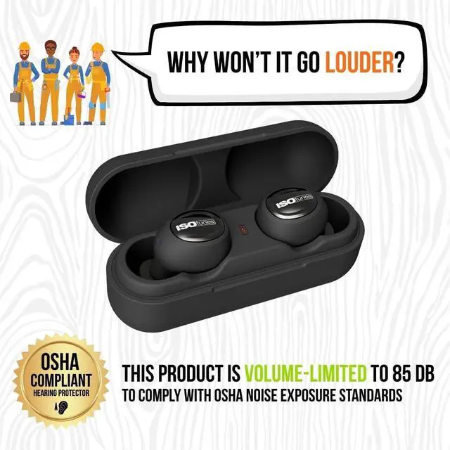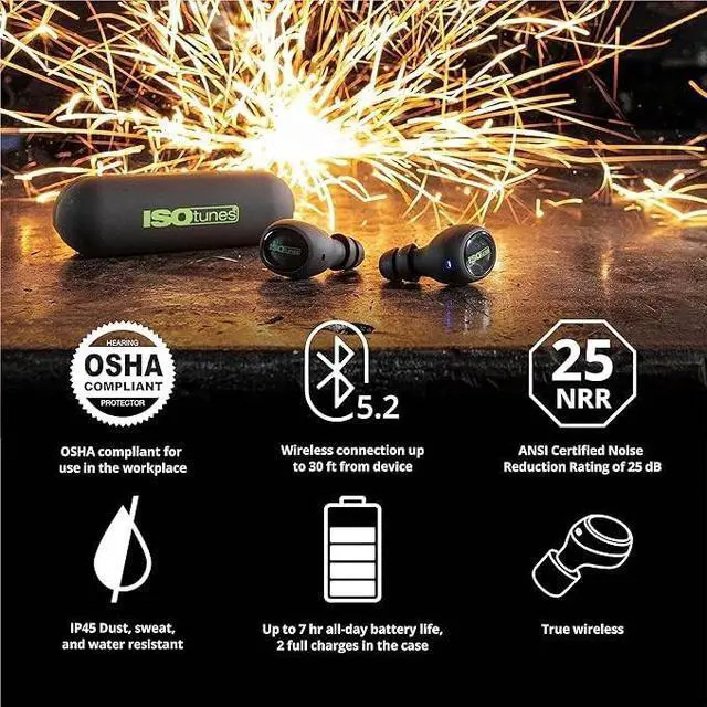 SafeMax audio limit: Work with confidence using OSHA approved earbuds designed to meet strict workplace hearing protection standards. These Bluetooth earplug headphones offer proven protection with enhanced communication abilities in a lightweight, true wireless design. ^^ All-day earplug headphones designed to get you through the longest shifts. Get 7 hours of continuous battery life in the bluetooth earplugs, plus 14 more hours from the protective charging case. ISOtunes FREE 2.0 Bluetooth hearing protection earbuds comes with 3 pairs of foam eartips (S, M, L) and 3 pairs of double-flange silicone eartips to give you many options to find your most comfortable fit. These ultra-small and lightwight hearing protection earbuds are designed to sit snugly in your ears and stay comfortable for extended use of many hours at a time. ^^ Bluetooth ear protection designed for clear calls in loud environments. FREE 2.0 earplug headphones feature noise suppressing microphones with noise cancellation technology to help block steady state noise like engines, mowers, fans, vacuums, and saws for clear calls in loud environments. Noise isolation for you, and noise cancellation for them. ^^ Hearing protection with Bluetooth that's built to last.