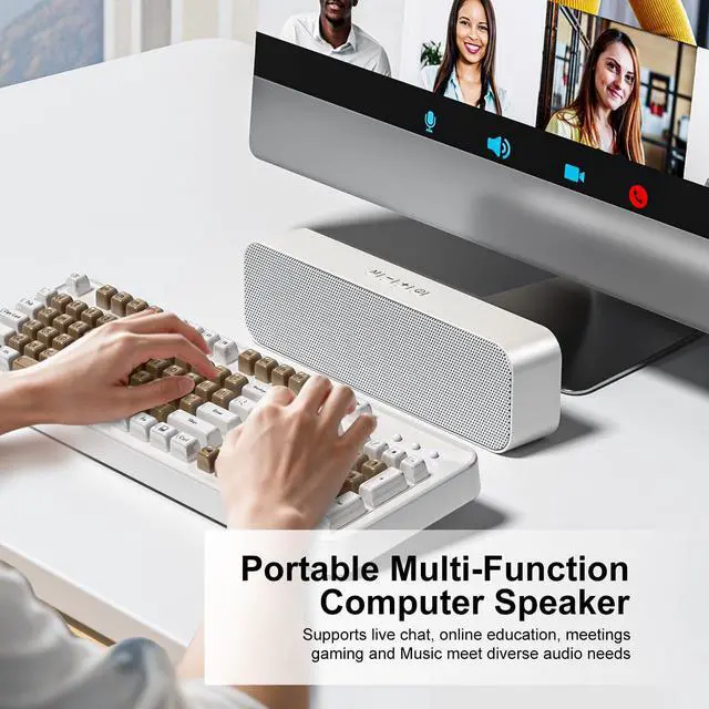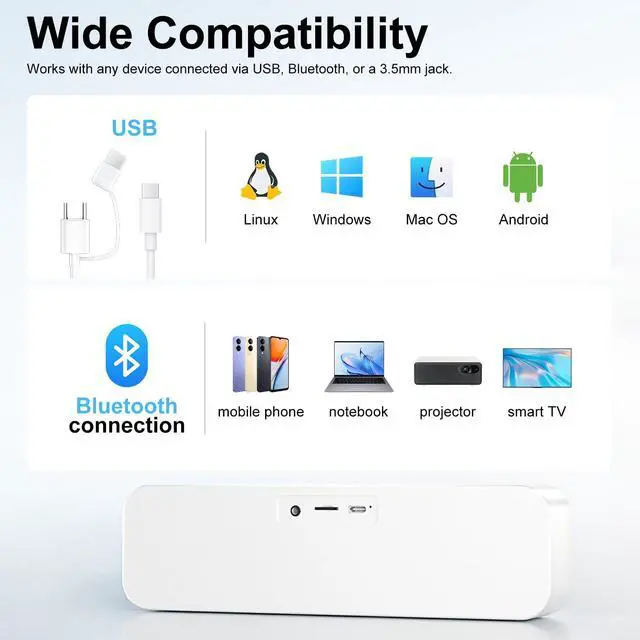 Enjoy more stable connections, lower power consumption, and stronger interference resistance for on-the-go use anytime, anywhere! Easily connect to Bluetooth-enabled devices like phones, tablets, TVs, and projectors. Alternatively, you can continue using the USB/Type-C cable for power supplychoose either method as desired. ^^ WIDE COMPATIBILITYThe BT67Pro features a compact size ( 8.7 x 2.6 x 4.5 inches) and comes in white, black, or pink. This computer speaker works with any Bluetooth-enabled device or device featuring a universal USB/Type-C port, such as phones/PCs/laptops/tablets/ projectors/smart TVs. Its space-saving design allows effortless use in any corner of your office or home for web conferences, music playback, movies, gaming, audiobooks, or online lectures.