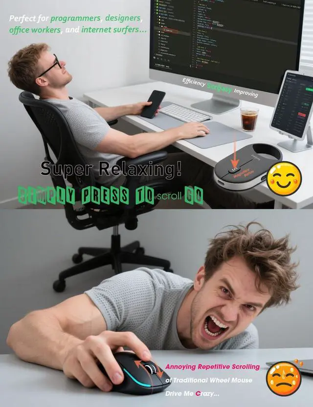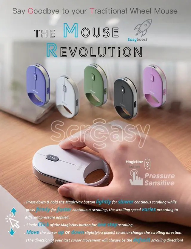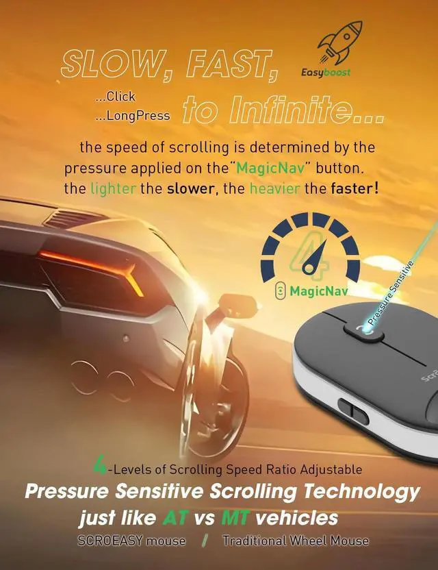 Intuitive Infinite Flying Scroll: Unique capacitive pressure-sensitive technology lets you control scroll speed intuitivelypress lightly for slow, firmly for fast, and click for one step scroll, Simply press the dedicated MagicNav button to enjoy smooth, adjustable scrolling (slow/fast) eliminates tedious wheel-twisting for effortless browsing, reading, or working. A true game-changer for navigation efficiency! ^^ Tri-Modes with 4