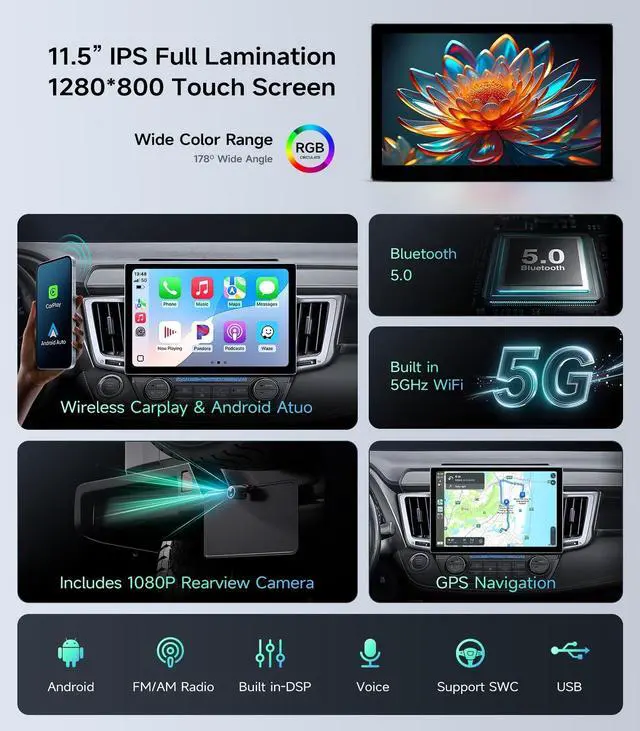 IMPORTANT: Unsure about fit? Send us a center console photo for 24-hour compatibility check. ^^ 8-Core CPU ^^ 4GB RAM + 64GB Storage5G WiFi & 11.5 -inch HD Touchscreen Car Stereo Plug-and-Play Standard Size, No Extra Accessories Needed! Upgrade Your Ride with Effortless Installation Just Follow Manual for a Fresh New Look! ^^ Wired/5G Wireless CarPlay & Android AutoThis Toyota RAV4 radio support wired/wireless CarPlay and Android Auto, you could more easily access the apps of your phone. You can also able to wake up the voice assistant Siri or Google Assistant to operate Apps on your rav4 radio, easily use GPS navigation, calls, message, music, and much more functions while keeping your hands free for safe driving. ^^ GPS Navigation & WiFi Car Stereo for Toyota RAV4Pre-installed North American maps + included GPS antenna for seamless offline routing. Built-in WiFi supports real-time map updates and online navigation for enhanced driving convenience. ^^ Bluetooth 5.0 Call ^^ Built-in EQ ^^ FM/AM RadioFast-pair Bluetooth 5.0 for music streaming & contact syncing. Dual mics (built-in + external) ensure crystal-clear hands-free calls. Tunable equalizer lets you customize sound profiles for immersive audio.