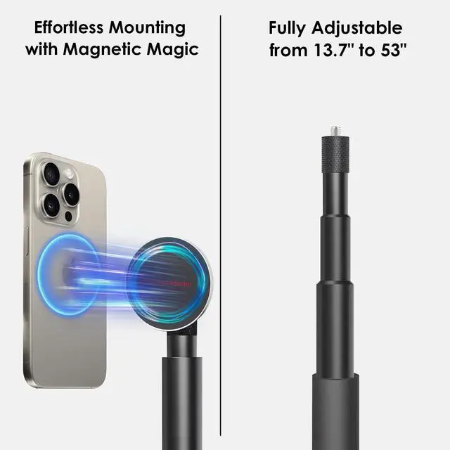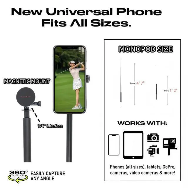 Effortless Mounting with Magnetic MagicThis golf swing recorder features a convenient magnetic phone attachment for quick and easy device placement. Focus on your swing, not fiddling with clips, and capture every moment with stability ^^ Fully Adjustable with 360 Rotation & HeightCustomize your golfing experience with our fully adjustable golf monopod stick. The smooth 360 rotation lets you capture every angle, while the adjustable height ranging from 13.7 to 53 inches ensures you get the perfect framing for any shot. ^^ Crafted with Premium Aluminum & 7'' Metal StakeExperience superior performance with our golf swing phone holder.