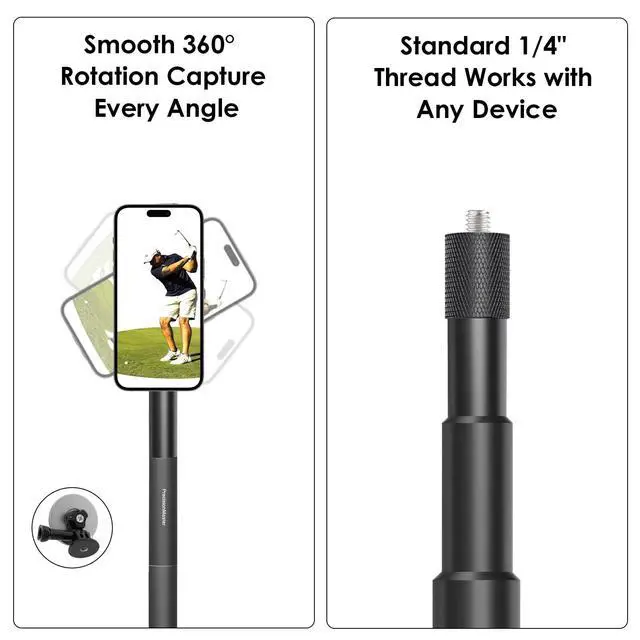 • Fully Adjustable with 360 Rotation & HeightCustomize your golfing experience with our fully adjustable golf monopod stick. The smooth 360 rotation lets you capture every angle, while the adjustable height ranging from 13.7 to 53 inches ensures you get the perfect framing for any shot.