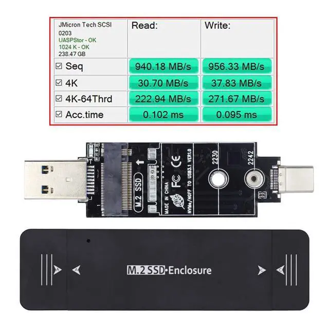 For SATA, it provides up to 6Gbps bandwidth. ^^ It supports a dynamically switching power state with NVMe/SATA/USB power management for power saving mode; Fit 2230/2242mm NGFF/NVME M. 2 SSD. (The NGFF SSD is not included)