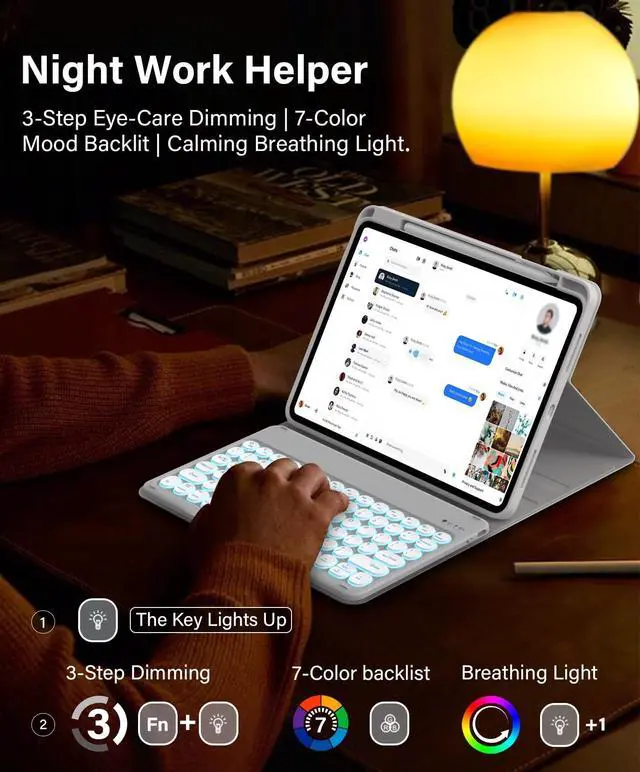 • Glow-Comfort Backlit7-color backlit with 3-step dimming (30%/60%/100%) eases eye strain. Enhanced by a dynamic breathing lightflowing gently as you type. This smart combo is ideal for iPad Air 10.9" 4th/5th Gen users working late or studying in dim light. Gentle light, happier eyes.
