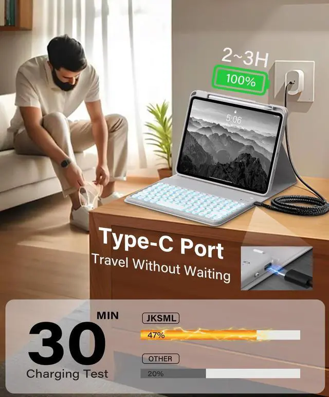 ^^ LongLast Power: 90+ Hours ReadyGerman military 450mAh battery with 1 min auto-sleep cuts wasted power by 80%. Enjoy 90+ hours use per 2-3H chargeforget to turn off your iPad Air 11" M3 2025 or M2 2024 keyboard? Instantly wakes with one click for urgent work or travel days. Always powered, always focused. ^^ Multi-angle Stable UseReinforced magnets hold your iPad Air 11-inch or 10.9" tablet secure at any angleeven upside down. 3 case slot (110/120/130) keep views stable for study notes or video calls. Tested against daily bumps and shakes across all compatible models.