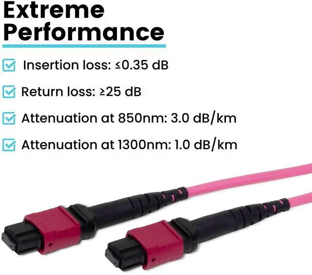 • [Quality Guaranteed] Floating ferrule design minimizes fiber contact wear, reducing signal loss over time. MTP/MPO Elite connectors ensure secure, easy mating for consistent performance. Elliptical guide pin tip and spring centering protect the fiber array for long-lasting performance. Delivers low optical loss for high-speed data transmission.