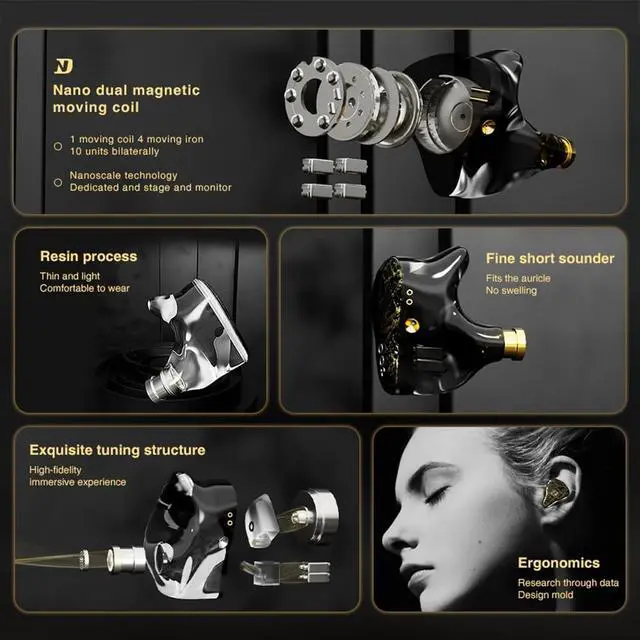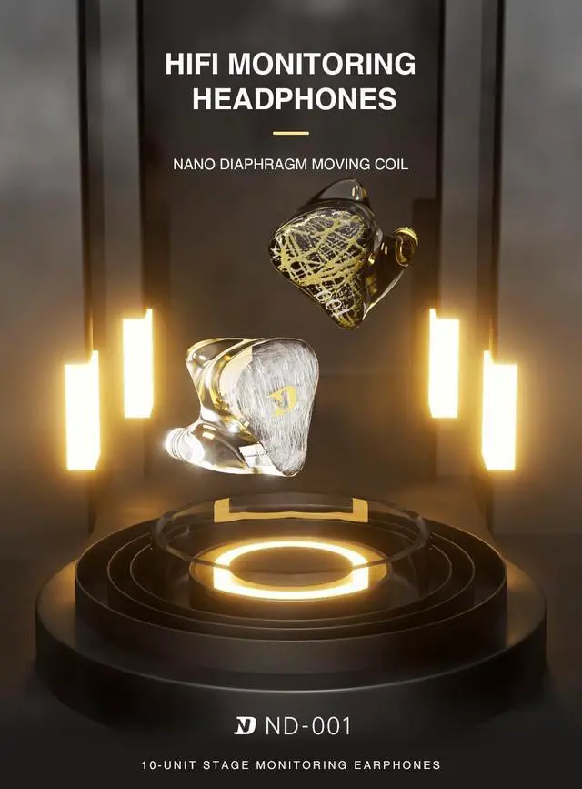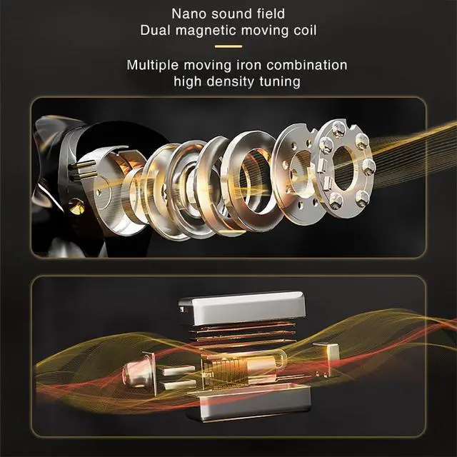 Upgraded 4BA+1DD Hybrid Earphones The ND 001 in ear monitors are equipped with two 50060 mid-frequency drivers and two 30095 high-frequency drivers. Combining the precision of the high-frequency balanced armature 30095 and the warmth of the mid-frequency balanced armature 50060, this earphone showcases the all-encompassing charm of audio. The 30095 captures intricate high-frequency details, while the 50060 delivers emotionally rich mid-tones, creating an immersive auditory experience. ^^ Double Magnetic Dynamic UnitThe ND 001 in ear headphones feature an upgraded dual magnetic dynamic design. Through precise magnetic field interaction, it delivers an extended frequency response and exceptional audio separation, capturing every nuance of your music.