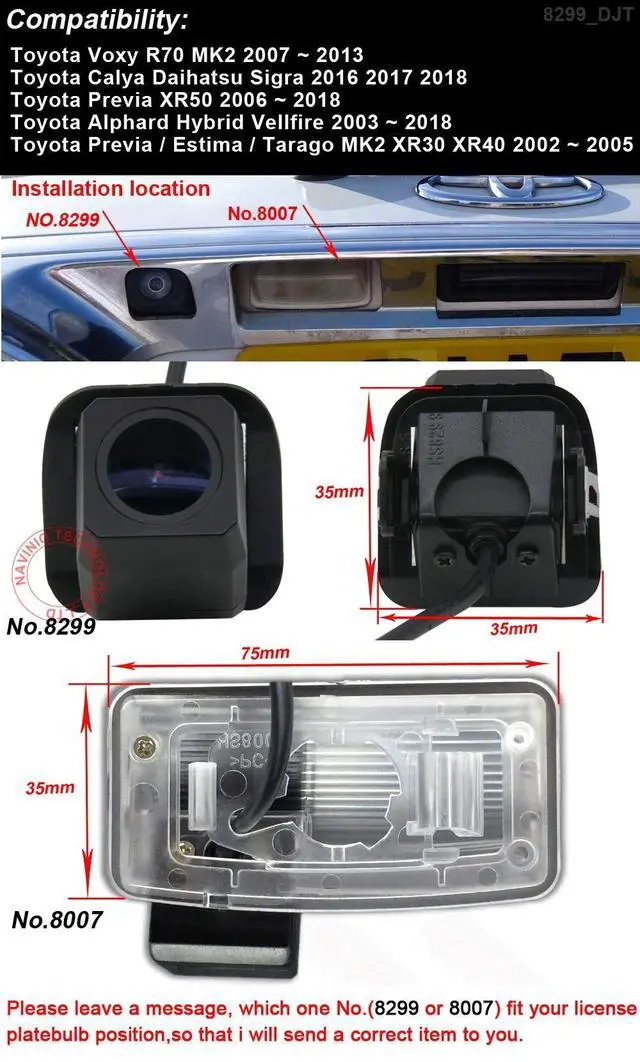 Dear customer, Please must check the camera size and appearance before place a order, see if can fit your car license plate lamp place size and appearance! Because the same car model in different countries may have some difference, please check the camera size and compare the installation of your car carefully to avoid mistake. This product could fit for all below models as expected: For Toyota Voxy R70 MK2 2007-2013/ Toyota Calya Daihatsu Sigra 2016 2017 2018/ Toyota Previa XR50 2006-2018/ Toyota Alphard Hybrid Vellfire 2003-2018/ Toyota Previa / Estima / Tarago MK2 XR30 XR40 2002-2005 /-