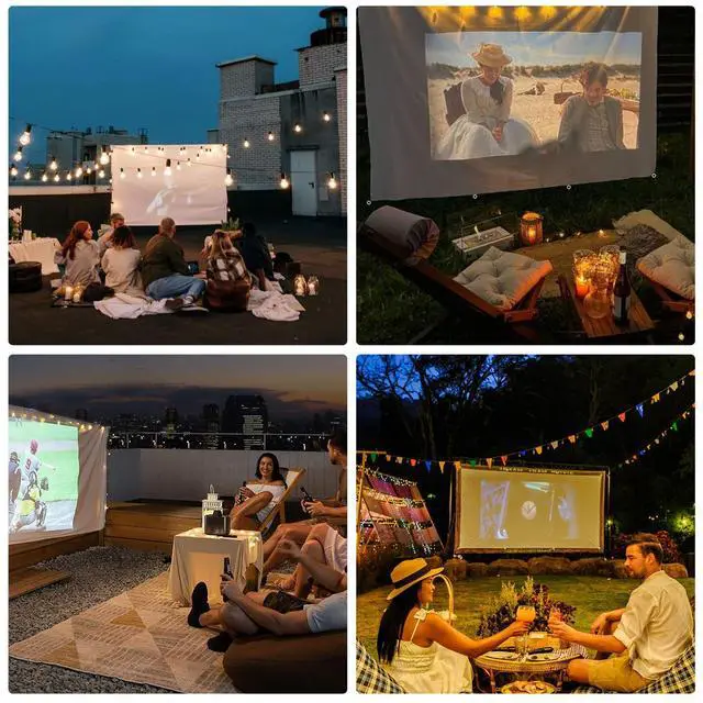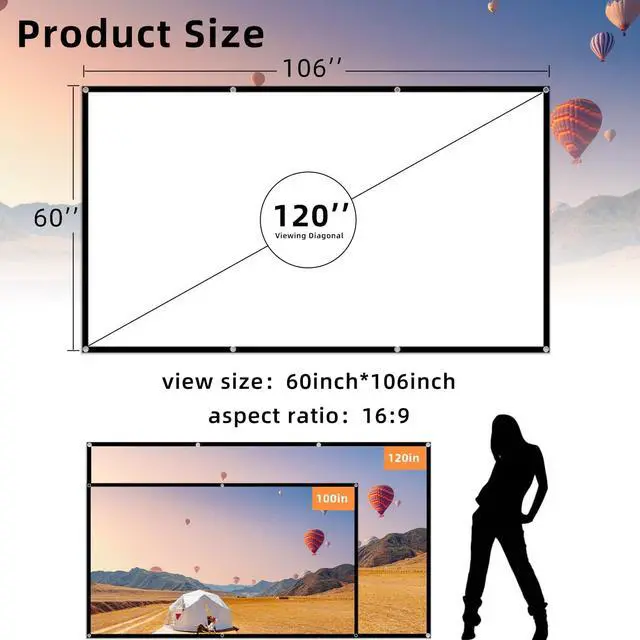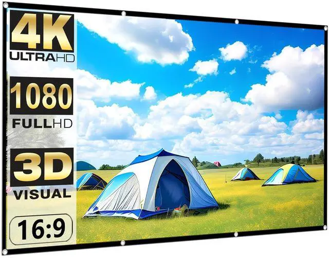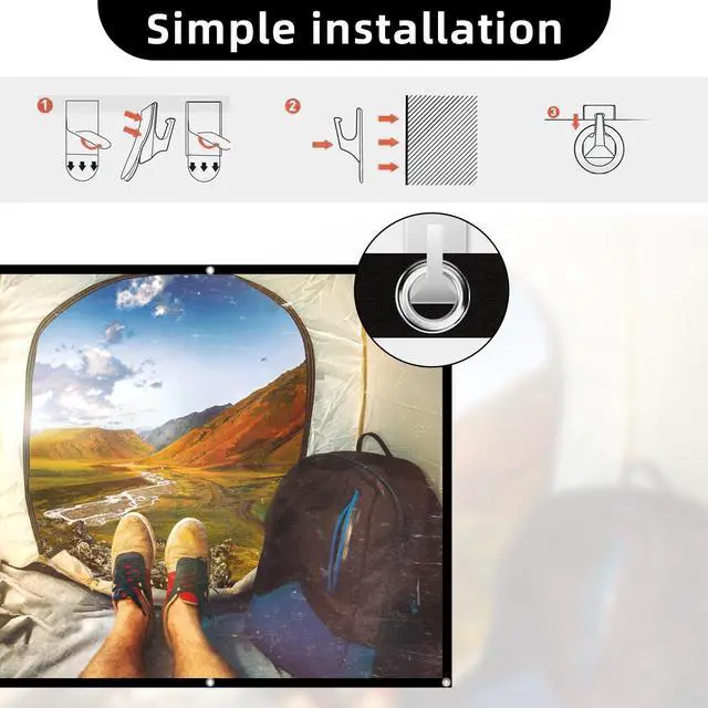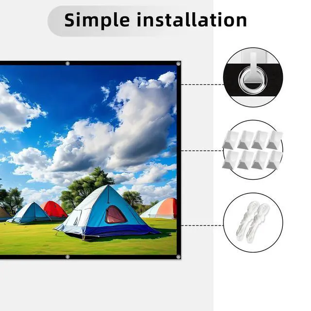 Cinema-Quality Visuals120" 16:9 large projection screen size allows you and your family to be immersed in the shocking picture at movie night, allowing you to enjoy the cinema big screen anytime, anywhere. Every scene comes alive with stunning clarity and depth ^^ Wide Application This washable 4K movie screen is suitable for outdoor light projector design, not only suitable for theater, camping, education, party, game, conference, swimming pool, classroom, In addition, the home projection screen can also be given as a present to your family, friends, lover, to enhance the relationship by sharing the viewing experience or talking about the plot or some important occasions on the theproject screen(Thanksgiving, Christmas, Weddings) ^^ Easy Installation and StorageThe screen comes fully equipped with a robust mounting system, allowing for quick setup whether it's wall-mounted or ceiling-hung.
