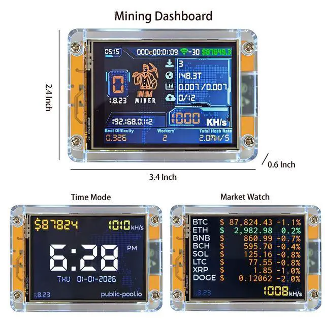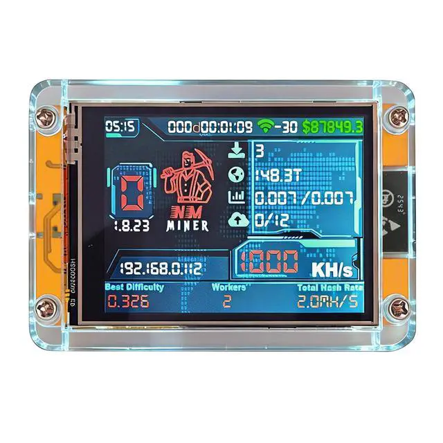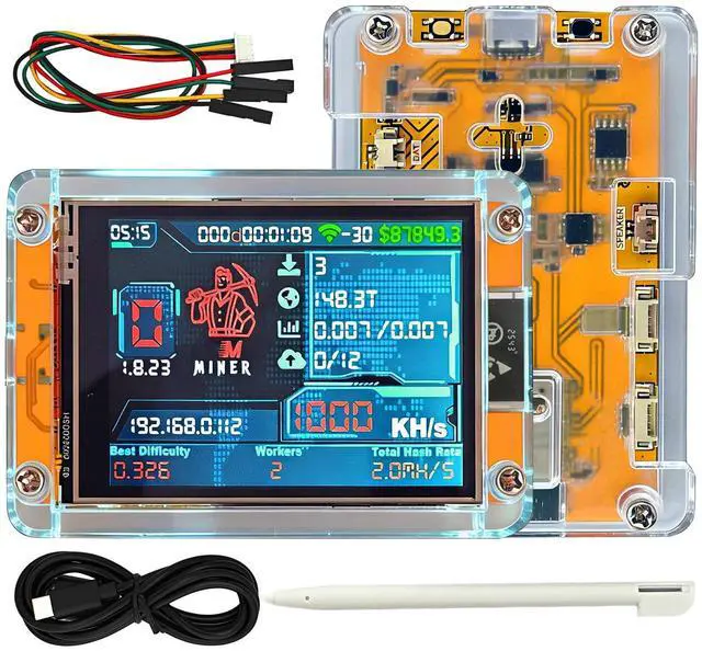 Discover the ultimate Bitcoin Lottery Miner your reliable Solo Bitcoin Miner for efficient Crypto Mining and versatile IoT projects! This Home ASIC Miner with 1010kH/s SHA256 performance comes with a detailed product manual to guide you through setup and operation easily, ideal for both beginners and seasoned Crypto Miner enthusiasts. Powered by the reliable ESP32 main chip (240MHz, 520KB SRAM, 4MB flash), it ensures smooth Bitcoin Mining. Equipped with a 2.8 -inch touch screen (240x320px), microSD card interface, and RGB LED, this Lottery Miner BTC offers intuitive control and ample storage for mining data or project files.