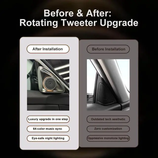 Plug-and-Play for Honda Accord 10th This tweeter is designed for a perfect OEM integration. You won't need to cut wires or make any permanent modifications. The simple installation process makes it easy for anyone to upgrade their car's interior. ^^ OEM-Grade Harness DesignCrafted specifically for your Honda Accord, the molding guarantees a precision fit. This eliminates any gaps or loose parts, providing a clean, factory-installed look with zero damage to your vehicle's trim. Connecting directly into your car's factory audio ports. ^^ Smart APP ControlTake full control of your lighting with our smart app, compatible with both iOS and Android.