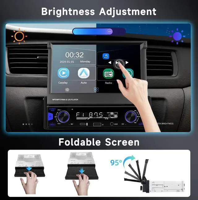 Retractable Design: Features a vibrant 7-inch HD IPS touchscreen (1024x600 resolution) for intuitive control and a crisp viewing experience. The retractable screen adjusts for optimal viewing angles or neatly tucks away when not in use, protecting the display and freeing dashboard space. Enjoy customizable Color Backlight settings for the buttons (requires small light wire installation). ^^ CarPlay, Android Auto &