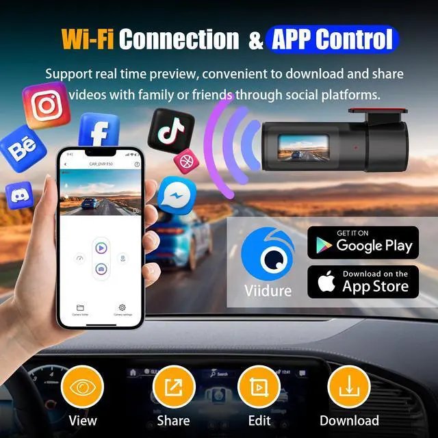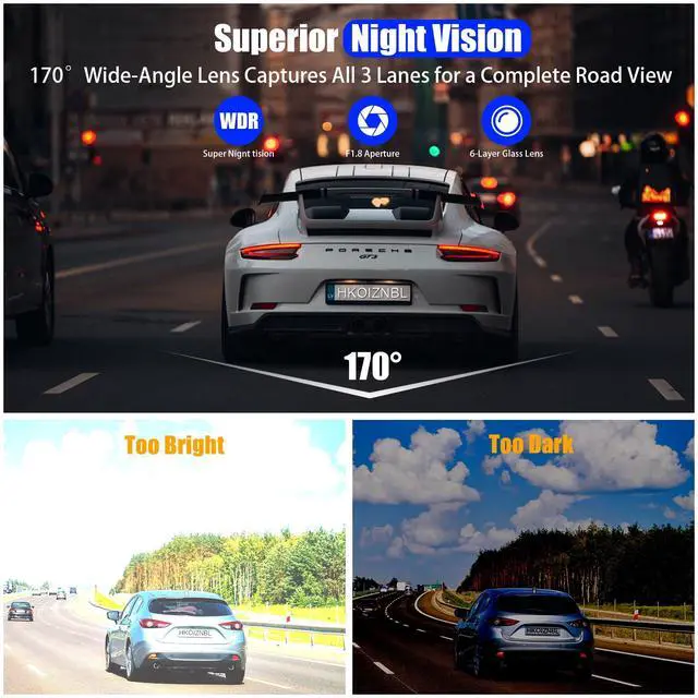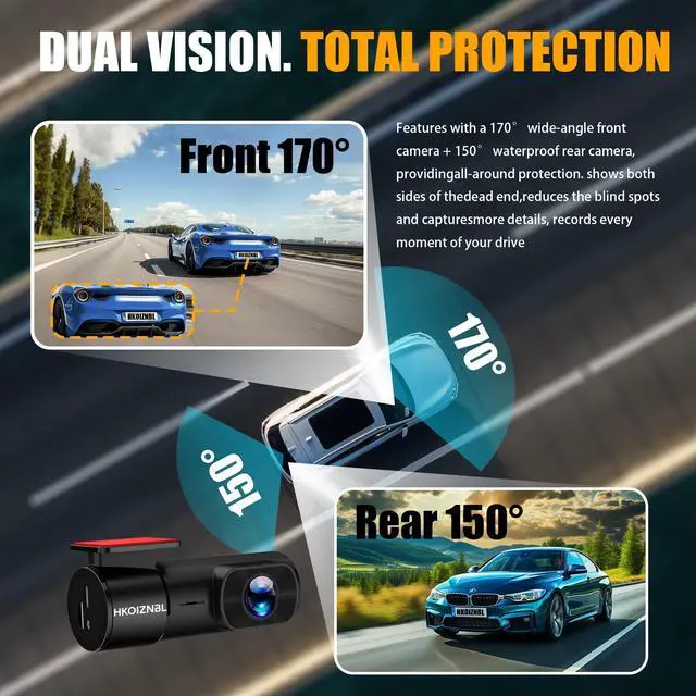 4K + 2.5K Full Ultra HD Dash Cam Front and Rear The HKOIZNBL front and rear dual-channel dash cam features a 4K ultra-clear front camera + a 2, 5k ultra-clear rear camera, sufficient to capture any detail during the journey. With a 170+150 ultra-wide viewing angle, the lens offers an expansive field of view, clearly covering three-lane road scenes, delivering excellent picture quality both day and night. ^^ Built-in 5G WiFi & App Control This 4K Ultra HD dash cam features an application compatible with both Android or iOS smartphones, allowing easy access to live streaming, video downloads, setting adjustments, as well as editing and sharing your recorded footage.