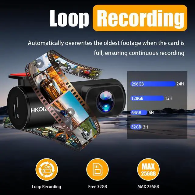 ^^ Clear Night Vision & Parking Monitor The HKOIZNBL dash cam features an F 1.8 aperture + 6-glass wide-angle lens, which automatically adjusts aperture to capture finer details (such as license plates) even in low-light conditions. The recorder automatically starts recording upon detecting vibrations (e. g., from collisions or theft attempts), providing 24/7 protection for your vehicle. ^^ Compact Dash CamThis 4K dash cam features a miniature design that occupies minimal windshield space, significantly enhancing your driving visibility. Additionally, it boasts a 1.47 -inch display for clear, real-time monitoring of road details during travel.