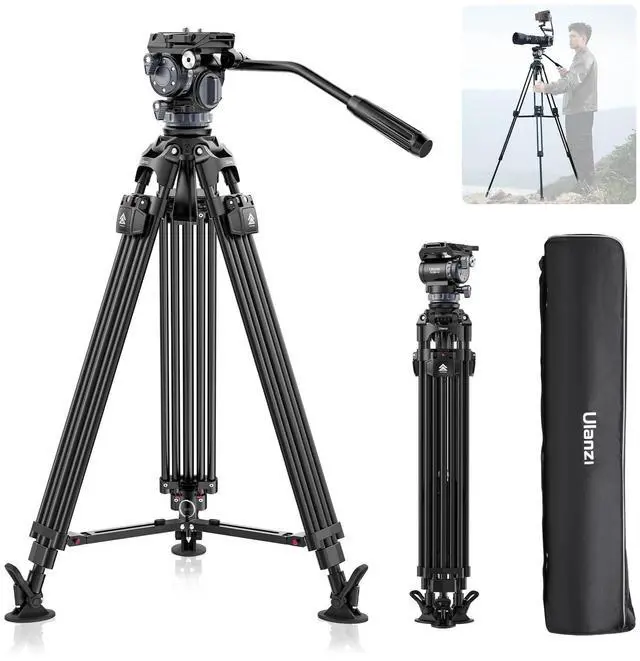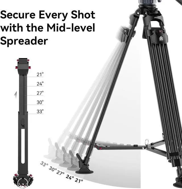 ^^ Stable Support DesignBuilt in Bubble level and 75mm bowl bottom provide better stability and balance for the video tripod. Secure Every Shot with the Mid-level Spreader. 5-step angle adjustment Pull the lifting ring to collapse the tripod in seconds. This heavy duty tripod ideal for Camera, DSLR, Canon, Nikon, Camcorder, Spotting Scopes. ^^ Lightweight & Easy to CarryThere camera tripod heavy duty has a detachable telescopic handle for easy storage and operation, and it suits both left-handed and right-handed users. Weight 10.5 lb( 4.8 kg), experience effortless transport with the removable carrying handle, which lifts the tripod with ease.
