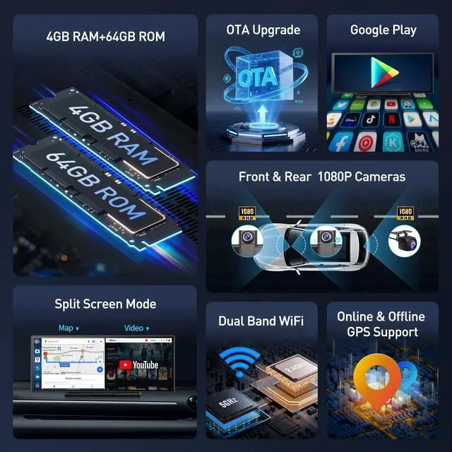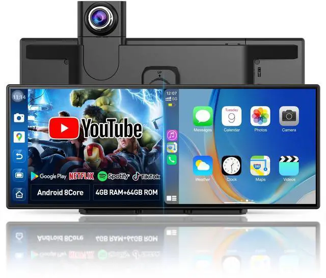 Performance: Experience faster, smoother Android performance with the Imagebon Wireless CarPlay Screen, powered by an 8-core processor. Switch seamlessly between Wireless CarPlay, Android Auto, or the built-in Android interface. With larger 4GB RAM and 64GB storage, run multiple apps, stream videos, and save recordings without lag ^^ Unlimited Entertainment with