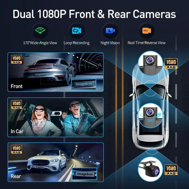 Rotating: Imagebon car play screen with front and rear 1080P cameras provide full road coverage, and the front camera rotates 180 for flexible angle adjustmentperfect for capturing both the road ahead and the car interior. Real-time rear view while reversing makes parking safer by clearly showing obstacles behind your vehicle ^^ Loop Recording with 64G