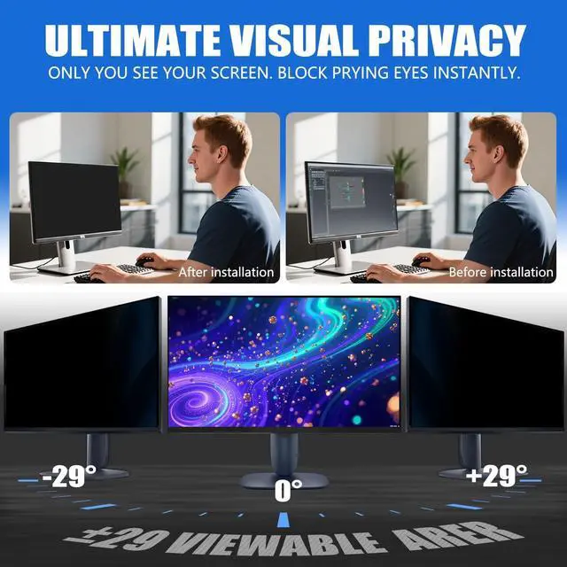 (Note: Excludes raised frames; not for curved monitors) ^^ Magnetic Attachment Snap On, Snap Off, Effortless! Say goodbye to messy adhesives! Our magnetic privacy screen attaches and detaches in seconds. Need privacy for work? Snap it on. Want a clear view for media? Snap it off. Ultimate convenience, redefined. ^^ Ultimate Privacy Shield Your Screen from Prying Eyes Protect sensitive information confidently. Using advanced micro-louver technology, the Twugs privacy screen ensures front-view clarity while blocking side-angle views. Ideal for offices, public spaces, cafes, or anywhere privacy matters. We're creating more private moments for everyone. ^^ Anti-Glare & Blue Light Filtering Comfort for Your EyesReduce eye strain during long hours. Our screen minimizes distracting glare (especially near windows or bright lights) and filters harmful blue light. Work, study, or browse comfortably for longer, feeling refreshed. ^^ Wide Adaptability & Durable PET Material Loved by students, professionals, and travelers. The versatile 27" size fits standard monitors, perfect for diverse settings. Crafted from high-quality, bend-resistant PET material, it resists scratches, oils, and daily wear, protecting both your privacy and your screen.