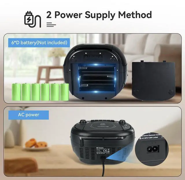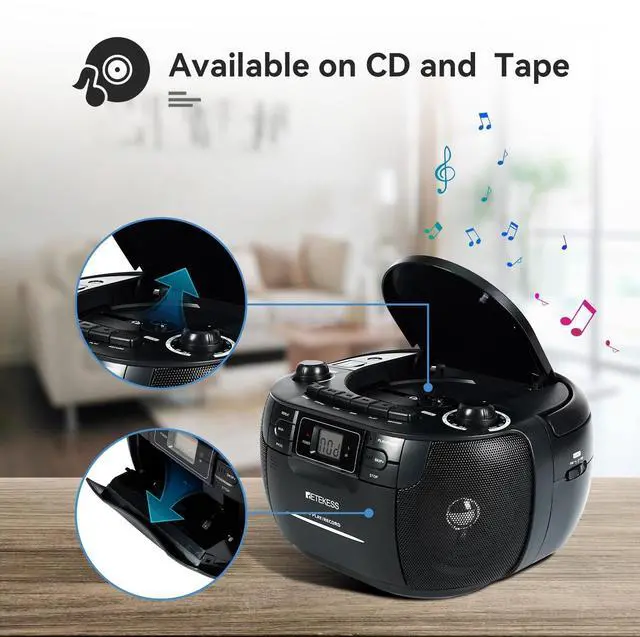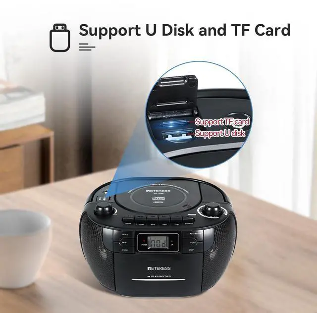 Boom box with cassette and cd player; Retekess TR621 supports CD/CDR/CDRW/MP3/WMA format discs; supports CD and tapes; you can fast forward and rewind when playing CDs or cassettes ^^ MP3 player; home audio radio supports micro SD card and USB flash disk input; when you play CD or USB music the CD player has a stereo sound ^^ Remote playback; control CD and USB playback but cannot control cassette and radio playback; the control distance is up to 32 feet ^^ CD cassette player am/fm radio; the CD player has AM and FM two channels; the antenna can be rotated 360 degrees and the reception is stable ^^ Tape recording; record CD; radio or external voice to tape; save your favorite CD music or radio; listen to it again anytime