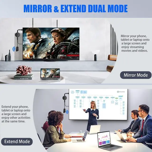Instantly start casting movies, presentations, and more for classrooms, meetings, hotel stays, and store showcases. ^^ FOR ANDROID & WINDOWS DEVICESThis wireless HDMI adapter is best for Android and Windows devices with support for encryption screen projection apps, you can enjoy seamless HD series, movies, and live sports from Netfix, Prime Video, Sky Go, BT Sport, Tiktok, Youtube, DIRECTV, HULU, Comcast TV, XFINITY, Vudu, Movistar and more. ^^ FOR IOS AND MAC OS DEVICES This wireless HDMI dongle can cast movies, photos, and music to a big display from free apps, such as Safari, Office apps, YouTube, WhatsApp, Skype, Twitter, Reddit, and more.