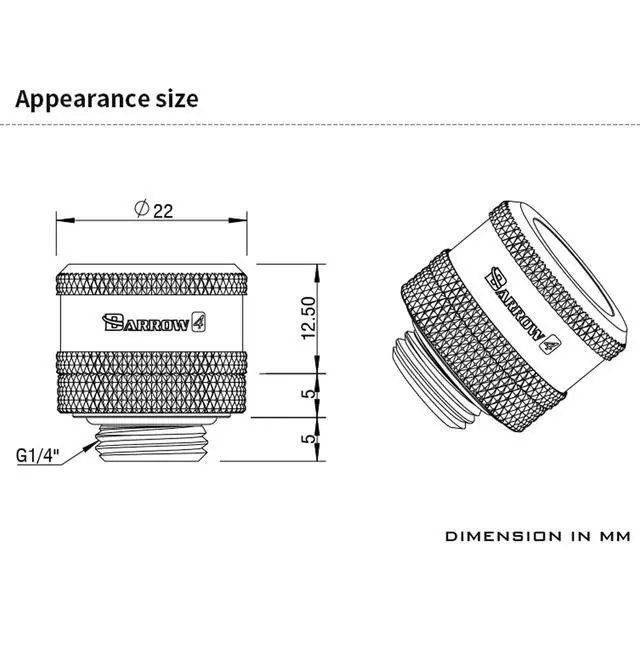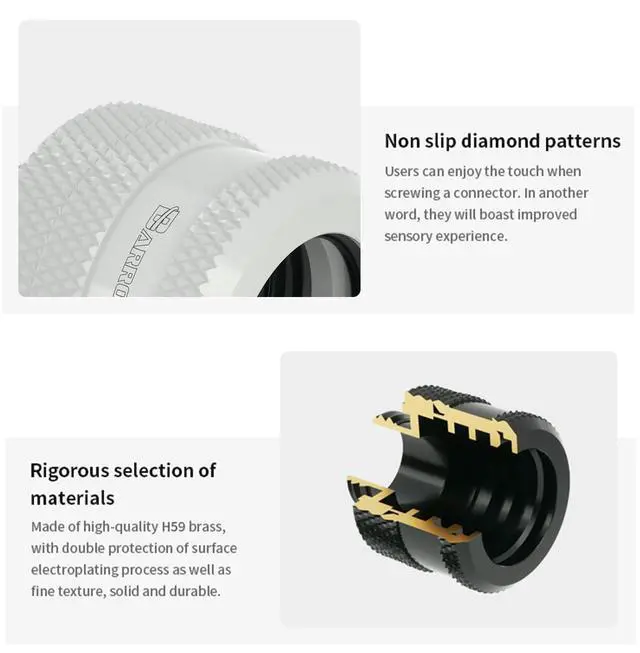 Wide FitEquipped with standard G1/4" threaded ports and designed for 14mm OD hard tubes, precisely machined ports ensure a perfect fit. Offers broad compatibility with mainstream hard tubing like PETG, Acrylic and Copper. ^^ DurableConstructed from high-quality brass with a special coated surface, providing excellent rust and corrosion resistance for long-term durability. ^^ Leak-Proof SealFeatures a built-in high-quality O-ring for reliable compression sealing, effectively preventing coolant leakage and ensuring safe and stable system operation. ^^ Quick InstallationSecurely install with a simple rotation, significantly simplifying hard tube loop assembly and saving time and effort.