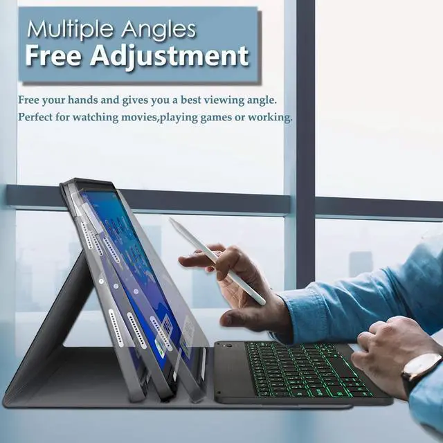 Removable wireless keyboard with case that transforms your tablet into a laptop or your favorite book in less than a second ^^ 7 Vibrant Colors Backlights7 vibrant colors make typing fun and easy in the dark or the light. And the case keyboard can be folded like a book, easy to carry around, it's perfect for studying or working in the office or at home. ^^ Rechargeable BatteryBuilt-in rechargeable Long-Lasting battery life. The keyboard charges for 2-3 hours and can work continuously for up to 90 hours under normal use. (without turning on the backlight).