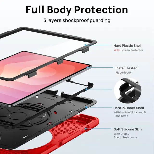 Compatible ModelsCase for Samsung Galaxy Tab S11 Ultra 5G 2025 14.6 inch, Model: SM-X930/ SM-X936B/ SM-X936N/ SM-X930N. Confirm compatibility under Settings > General > Model. ^^ Full-Body Protection & Screen ProtectorCase for Galaxy Tablet S11 Ultra delivers full-body protection. Its triple-layer defense combines a shock-absorbing silicone exterior, a hard PC inner shell, and a built-in screen protector to guard against drops, bumps, and scratches. Designed for durability, it's the ideal choice for busy professionals, outdoor travel, and parents looking for kid-proof security. ^^ 360 Rotatable Stand and HandleCase for Galaxy Tab S11 Ultra with a 360 rotatable stand, securely locking at multiple angles for typing, watching, or video calls. One-handed usable hand strap suited for classes, meetings, works or play with-kid. ^^ Mechanical Button for Instant DeploymentCase for Galaxy Tab 11 Ultra with mechanical button for 1-Second stand deployment/retraction. A dust cover is specially equipped at the hole, effectively preventing the intrusion of dust and water droplets, ensuring that your device interface is always clean and safe. ^^ Adjustable Shoulder Strap & Built-in Pen HolderCase for Galaxy S11 Ultra 2025 5G 14.6" easy to hang the tablet with a shoulder strap, convenient for outdoor, travel, and family use.