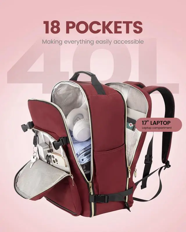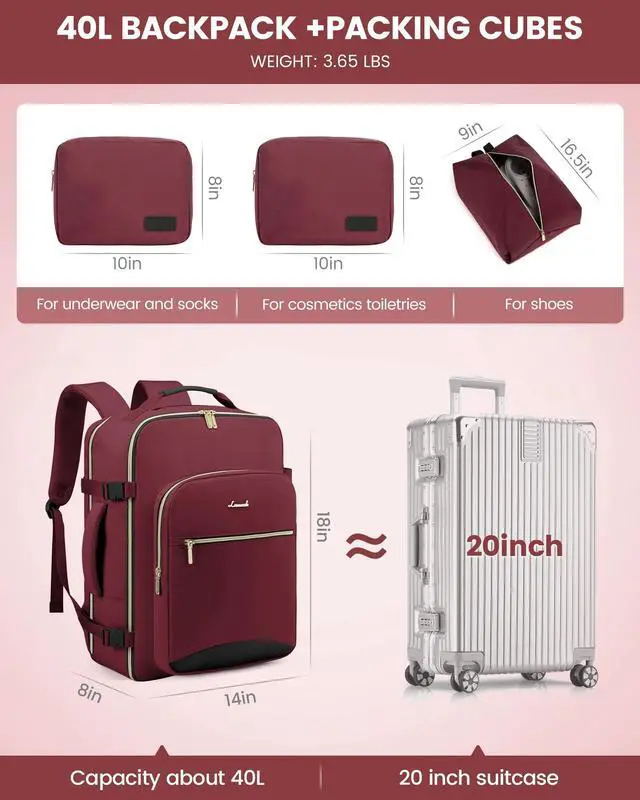 Multiple Pockets: The travel backpack for women with a 40L capacity and 4 main compartments, this travel backpack can meet both your daily and travel needs. It can easily accommodate all your items for a 3-5 day trip. ^^ Includes 3 Packing Cubes and
