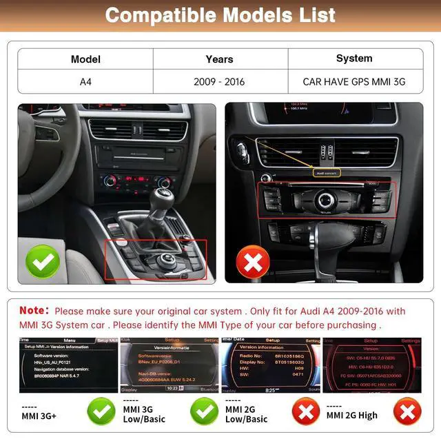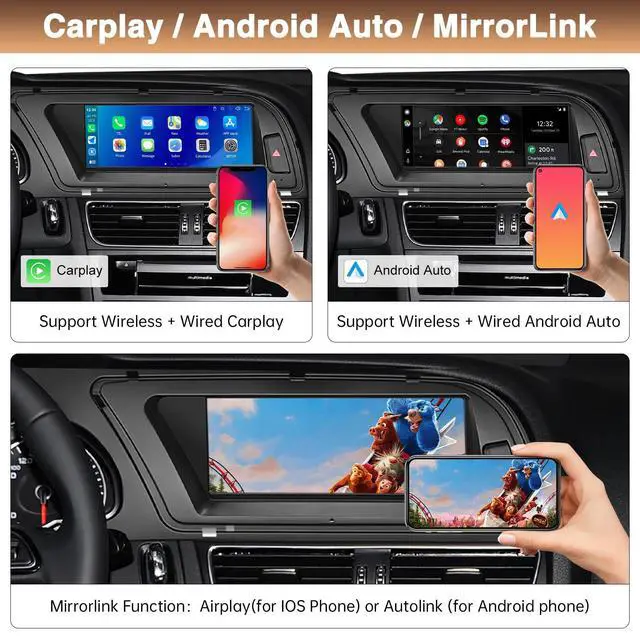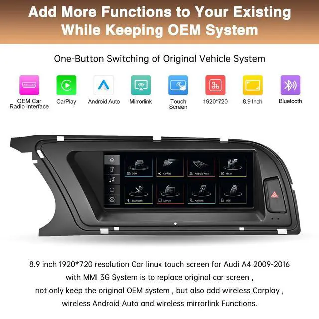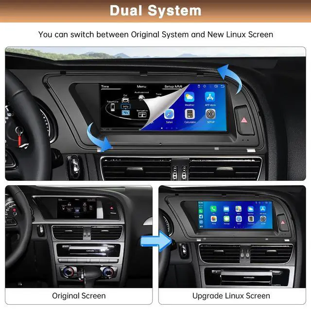 ^^ Car Upgrade Screen for A4 Built-in Wireless/Wired CarPlay and Android AutoUse your phone in safety while you drive. By simply saying ""Hey Siri"" or ""OK Google"", to get directions, make calls, send & receive messages, and enjoy your favorite music. Get access to voice commands, Siri & Google Assistant can help you do all of these things. ^^ Dual Systems for CarNot only retain the original OEM system functions, but also add wireless Carplay, Android Auto and mirrorlink Functions. One-click Dual-system Switch Seamlessly switch between Linux and original car systems.
