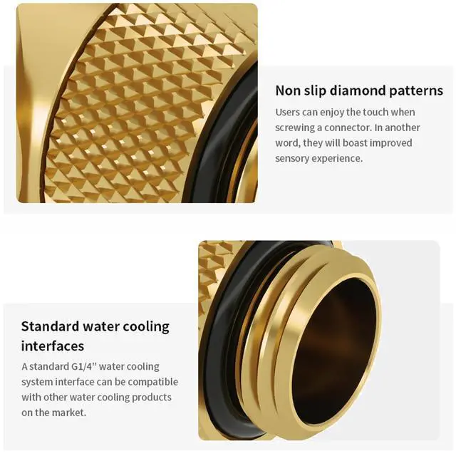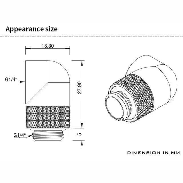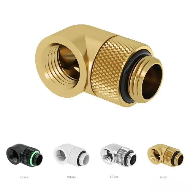 90 Angle 360 RotaryExtenal connector featuring a fixed 90 angled elbow and 360 rotation capability for precise alignment adjustments and easy installation. Ensures quick, secure connections with simple tightening. ^^ Leak-ProofBuilt-in silicone O-ring, rotary adapter ensures reliable sealing, effectively prevents coolant leakage, and maintains safe and stable operation of the water cooling system for extended periods. ^^ Universal ThreadWith G1/4" male-to-female thread design, it offers broad compatibility with metal, PETG and rigid tubing. It is suitable for connections between components in PC water cooling systems such as block, radiators, and water pumps etc.