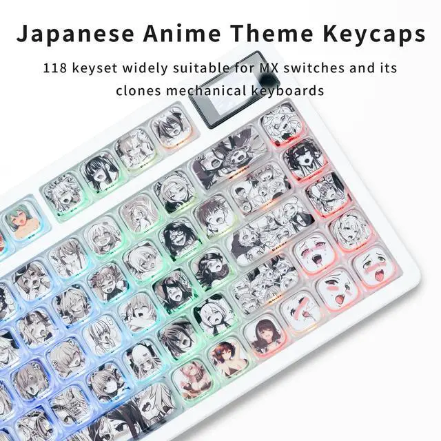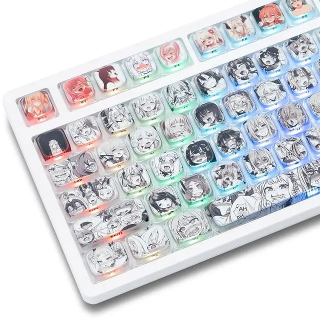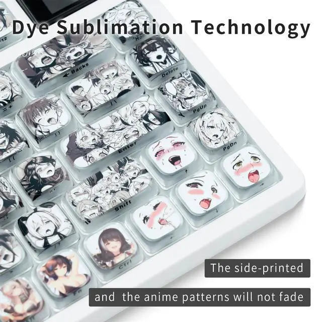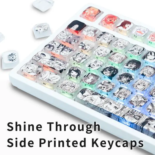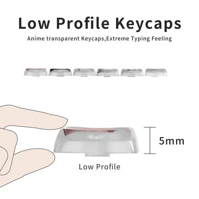 Anime Themed Clear KeycapsThe top of the keycap is a thermal sublimation anime pattern, and the four sides of the transparent keycap are frosted, which has better light transmittance, making your keyboard's RGB lighting effects more dazzling. ^^ Low Profile KeycapsThis keycap is a short axis keycap, shorter than the traditional height keycap. This keycaps set can match traditional height switch and Low height switch. The low profile keycaps is designed to provide the ultimate typing and gaming experience when operating the keyboard. ^^ Dye Sublimation Side Print KeycapsThe anime pattern penetrates into the PBT keycaps through thermal sublimation process, so that the pattern will not fade during long-term use.