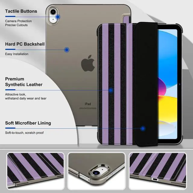 Model numbers: A2696, A2757, A2777. Not compatible with any other iPad models ^^ Auto Sleep/Wake Function -- Automatically puts your iPad to sleep when closed and wakes it up when opened, saving battery life. ^^ Trifold Stand -- Adjustable 3-fold design offers two viewing modes: one for media viewing and another for comfortable typing. ^^ Durable & Scratch-Resistant -- The case is made from high-quality PU leather and features a hard PC back, offering excellent protection against scratches and fingerprints. ^^ Transparent Hard PC Back & Soft Microfiber Interior -- The transparent, hard PC back allows you to display your logo while providing strong protection. The soft microfiber interior prevents scratches on your iPad screen and ensures safe handling.