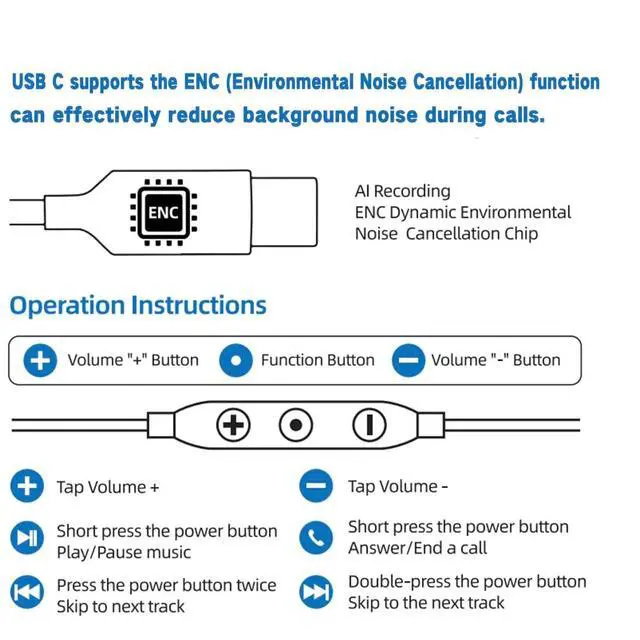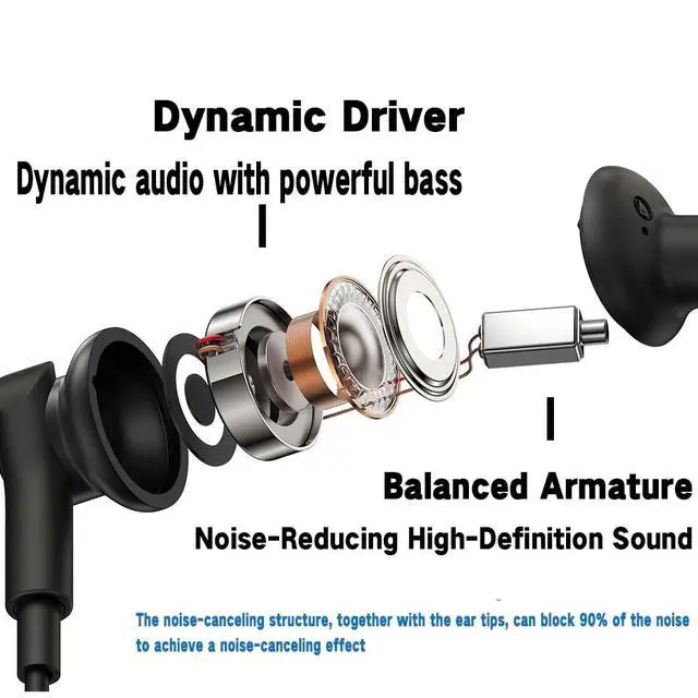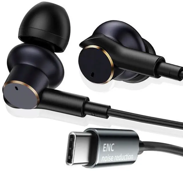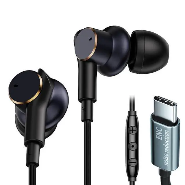 Experience crystal-clear calls and immersive audio with these USB-C wired earbuds featuring advanced Environmental Noise Cancellation (ENC) technology. The dual-driver design delivers dynamic audio with powerful bass, while the balanced armature ensures high-definition sound reproduction. Perfect for busy environments, these earbuds effectively filter out background noise during calls - whether you're in a noisy subway station or a bustling office. The intuitive controls include volume adjustment, call management, and music playback functions, all easily accessible through the in-line control panel. These in-ear headphones combine sophisticated noise-filtering technology with ergonomic design for comfortable extended wear.