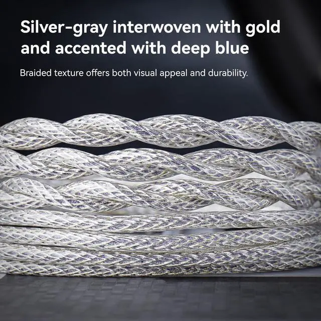 And the cable is Silver-gray interwoven with gold and accented with deep blue. Braided texture offers both visual appeal and durability. " ^^ "Durable Use IEM Cable These plugs are all designed aircraft aluminum anodized plugs, ensuring a longer lifespan for the earphone plug. What's more, the cable Wear-resistant and scratch-resistant, stays like new even after long-term use. Multi-layer structure minimizes signal crosstalk and external noises"