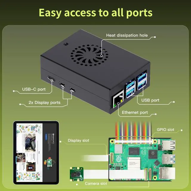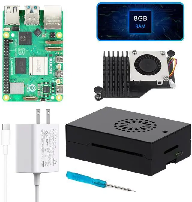 Package Include: 1x Pi 5 8GB, 1x Pi 5 Metal Case, 1x Pi 5 27W PD Power Supply, 1x Active Cooler. ^^ High Quality Metal CaseSpecifically designed for the Pi 5, this case perfectly fits the board and is secured with just four screws. It keeps your Pi 5 safe from physical damage and external interference. The ventilation cutouts improve heat dissipation, Features a transparent power button for clear visibility of the Pi5 power indicator status. ^^ High-Performance Cooling System The active cooler features an anodized aluminum heat sink paired with a PWM fan. It delivers excellent heat dissipation, quickly drawing heat away from the Pi 5 board to effectively reduce temperatures and maintain a stable operating environment. ^^ High Power DeliveryiRasptek 27W USB-C Power Supply is an ideal power supply for Raspberry Pi 5, especially for users who wish to drive high-power peripherals, such as hard drives and SSDs, from Pi 5s four Type A USB ports. ^^ Welcome to the latest generation of