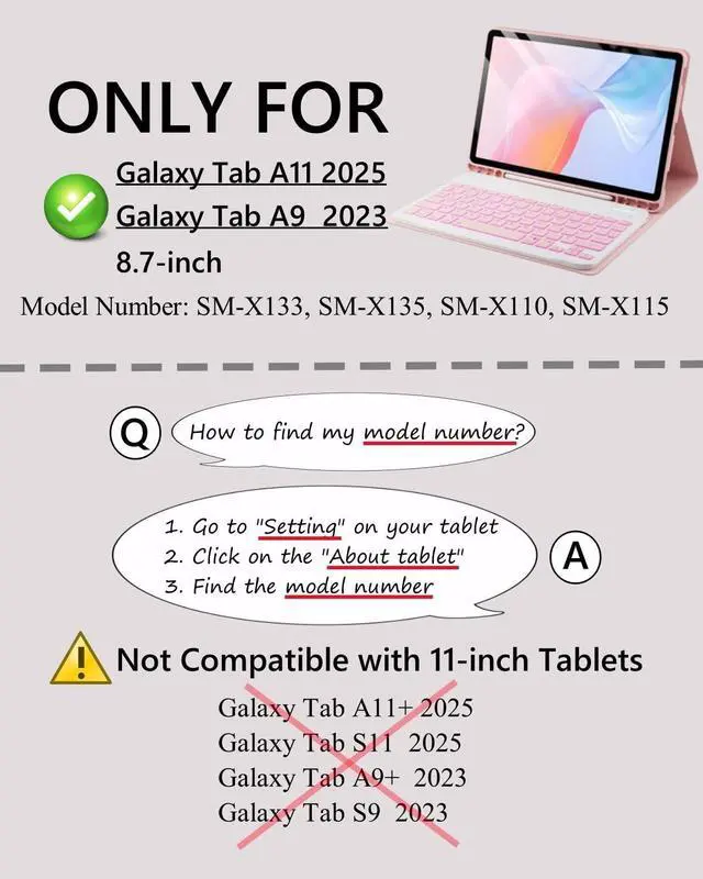 Model CompatibilityDesigned Only for Samsung Galaxy Tab A11-2025/ A9-2023 8.7 -inch (SM-X133, SM-X135, SM-X135F, SM-X110, SM-X115), Not compatible with other models. You can check the model number before purchasing to make sure you get the correct size tablet keyboard case. ^^ Magnetically Detachable Backlit KeyboardCase for Samsung Galaxy Tab A11/ A9 comes with a detachable magnetic keyboard. The ultra-thin and lightweight magnetic keyboard can be firmly attached to the case, which helps the tablet stand upright and turn it into a mini laptop in less than a second. Use the optional backlight mode to choose your favorite color from 7 colors for smooth typing in the dark, even when working at night.