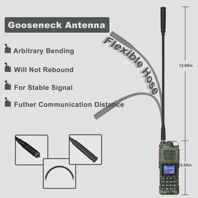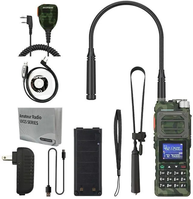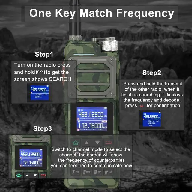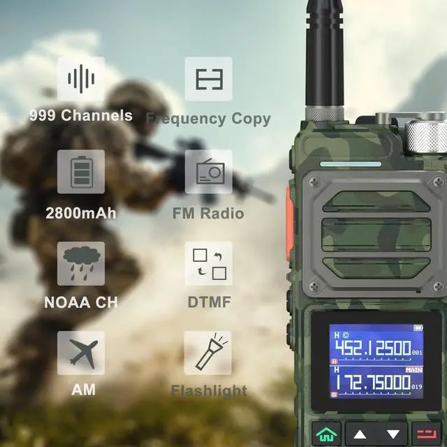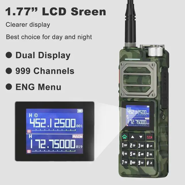 range: FM, AM, UHF, VHF Mutli-BandOne touch search frequency, easy pairing and grouping (copying channel configuration parameters) frequency step, selectable between 2.5K ^^ 5.0K ^^ 6.25K ^^ 10.0K ^^ 12.5K ^^ 20.0K ^^ 25.0K ^^ 50.0KF requency hopping to keep your call privacy confidential 1.77" TFT large screen, full keyboard, fully open menu operationChannel scan, frequency scan, and three scan and recovery methods: TO, CO, and SEUp to 999 memory channelsBroadcast FM radio receiver 65-108 MHzPower-on password management functionDual watch / Dual reception/ Dual-band handheld transceiverDTMF encoder and DTMF manual dialHigh Capacity Lithium-lon batteryVOX (voice activated transmit) Stopwatch functionAlarm functionDisplay illumination programmable via keypadHigh or low power selectableFunction beep on the keyboardProgrammable repeater offsetBattery save functionTen (10) levels of Squelch adjustmentTwo (2) pins for accessory portEnd of transmission tone, aka Roger Beep'Support NOAA weather reception functionTechnical
