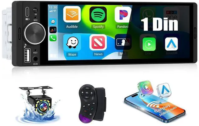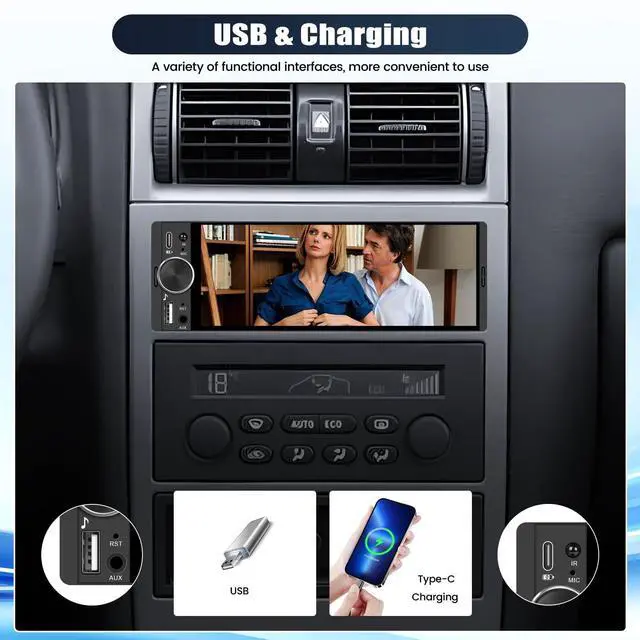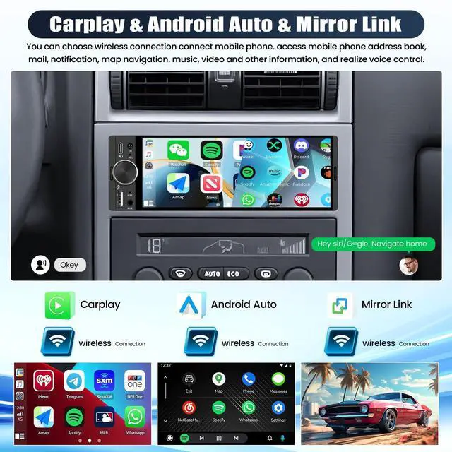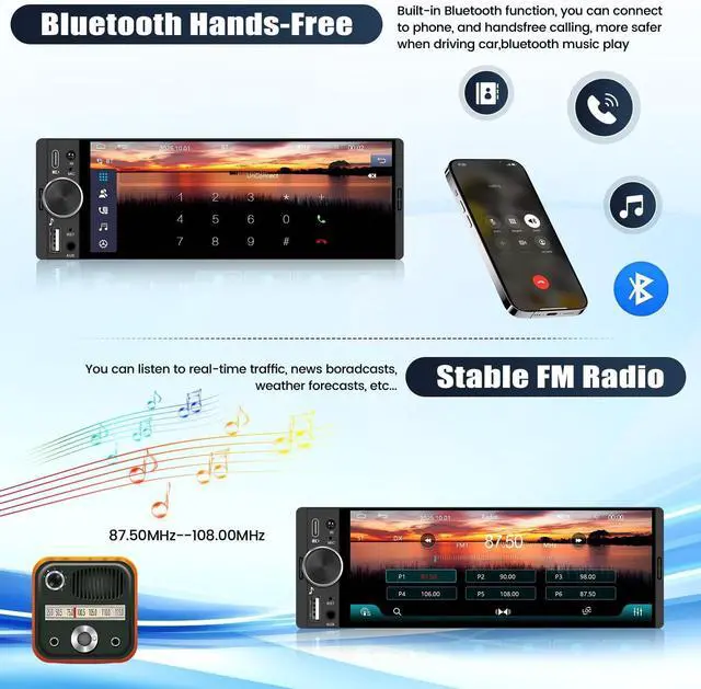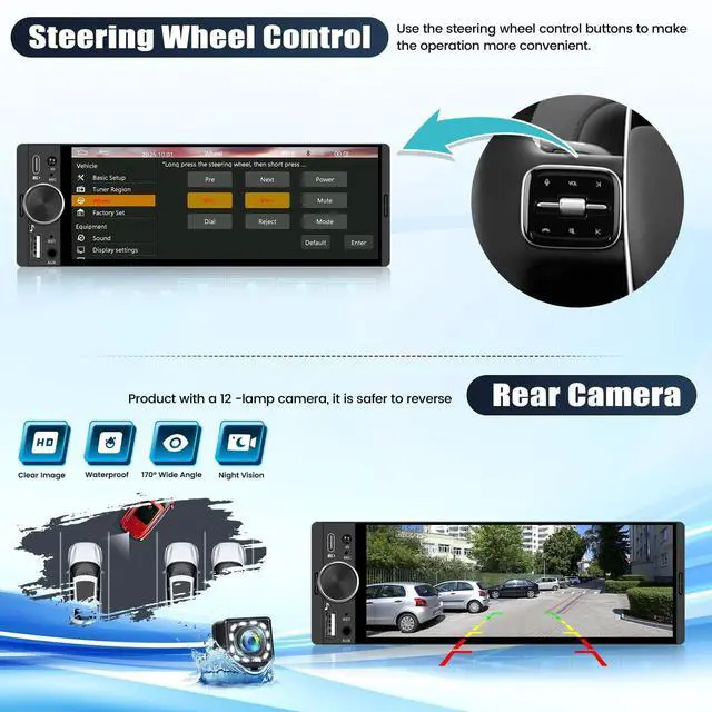 Upgraded Dual system mirror link: IOS/Android mirror link(IOS/one-way, Android) ^^ FM Radio & EQ SettingFM 87.5 -108, with 18 preset stations, select your favorite stations and save it. You could know daily news anywhere anytime. Equipped with EQ equalizer, excellent noise reduction, bass enhanced amplification, creating an immersive music feast ^^ Bluetooth & USB/Type-CConnect to your phone with bluetooth, you could achieve hand-free, listen to your phone's music and audiobooks. Support U disk and USB charging, you could download the favorite movie in U disk, then play in the stereo, provide you a safer and interesting driving trip ^^ Rear View Camera Input & SWCCar stereo with a backup camera, when reverse gear pull, the stereo screen will automatically shows the image. With Steering wheel control function, Needn't to get up to press the function button, only need steer wheel control learning, and then you can control your needs on the steering wheel