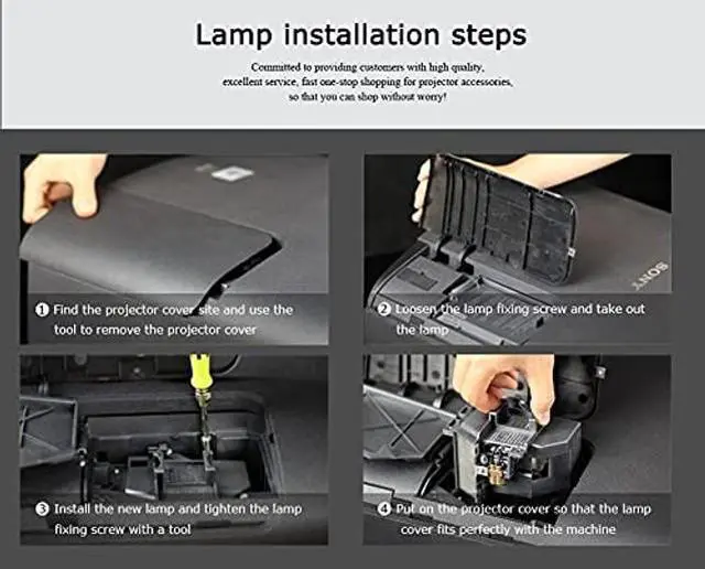 Projector models: Fit for BL-FU195A /BL-FU195B /BL-FU195C /BL-FU190E /SP. 8VC01GC01 /RLC-100 /5J. J9R 05.001 HD142X HD27 EH345 H183X TW342 S341 S340 W331 DH1011 EH300 HD131X HD2500 HD30B HD25e HD131Xe HD131XW EC300ST BR28HD PJD7828HDL PJD7720HD PJD7831HDL MX570 MX525 MS521P MS524 MX528 MX505 MS506 MS504 MX507 MX522P BS3030 MS3081+ MS504A MS504P MS506PMS507 MS512H MS514H MS517H MS522P MS524B MS527 MS527P MX3082 MX3082+ MX505A MX507P MX525B MX528P TS521P TS537 TX538 ProjectorsInstalling a Projector LampTo install a projector lamp with the housing, just follow the easy steps below: 1. Make sure the projector is unplugged and sitting on a flat surface2. Loosen the screw holding the projector lamp module cover in place and remove the panel3. Unplug the old projector lamp and remove it from the projector4. Plug the new projector lamp securely into place5. Attach the panel back onto the projector and tighten the screw