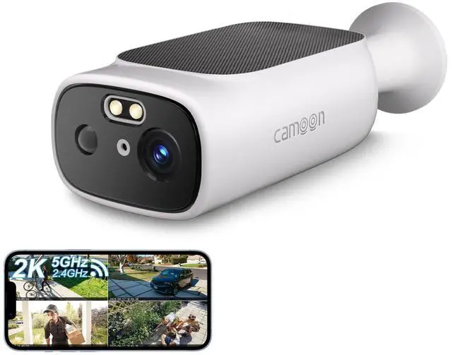 Uninterrupted Power for Peace of Mind- Solar-Powered & 9600mAh High-Capacity Battery Addressing the pain of frequent battery replacements, CAMOON's wireless outdoor security camera combines an embedded solar panel and a robust 9600mAh battery to ensure 365 days of uninterrupted power, giving you peace of mind without the worry of dead batteries. ^^ Stable WiFi Connection for Seamless Monitoring- 5/ 2.4GH z Dual-Band Networks Eliminating the frustration of unstable WiFi connections, our camera supports both 5GHz and 2.4GH z dual-band networks, providing a reliable and stable connection that's easy to set up in just 2 minutes, ensuring seamless monitoring wherever you are.
